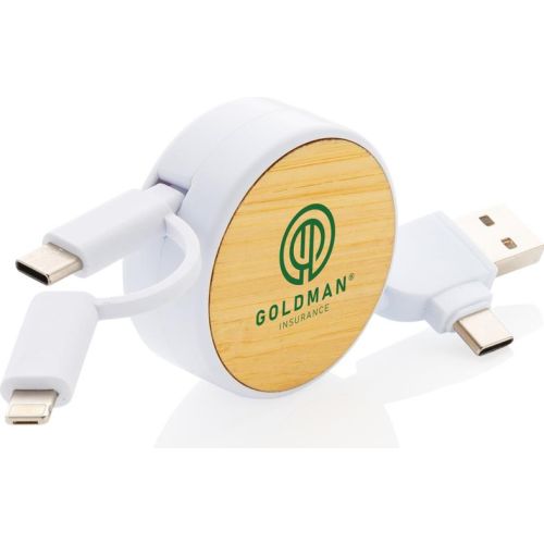 Dieses Kompaktes und einfach zu transportierende, ausziehbare Multikabel aus zertifizierten Recyclingmaterialien hat 5 verschiedenen Anschlüsse: USB-C-Eingang, USB-A-Eingang, Type-C-Ausgang, IOS-Ausgang und einen Micro-USB-Ausgang. Dadurch können Sie das Kabel auch mit Type-C Ausgabegeräten verwenden, die in der neueren Generation von Telefonen und MacBook-Computern verbaut sind. Das Kabel verfügt außerdem über eine USB-A-Output-Input-Option, sodass es jedes Gerät von jeder Ausgangsquelle aufladen kann. Das Gehäuse aus FSC-Bambus und RCS-zertifiziert recyceltem ABS, das Kabel aus RCS-zertifiziert recyceltem TPE-Material. Gesamter Recyclinganteil: 63% basierend auf dem Gesamtgewicht des Artikels. Maximale Kabellänge: 100 cm. Verpackt in einer FSC Mix-Verpackung aus Kraftpapier. PVC-frei. Konformität der Richtlinie für den Inhalt von Phtalaten, Konformität des PAHS-Inhalts in REAC & ZEK 01-4-08, Konformität der Richtlinie für Gefahrgüter 2011/65/EC & 2015/863, frei von einzel- und mehrkettige, chlorinierten Paraffinen, Zertifikat des Recycled Claim Standard. Verpackung: Polybag und bulk.