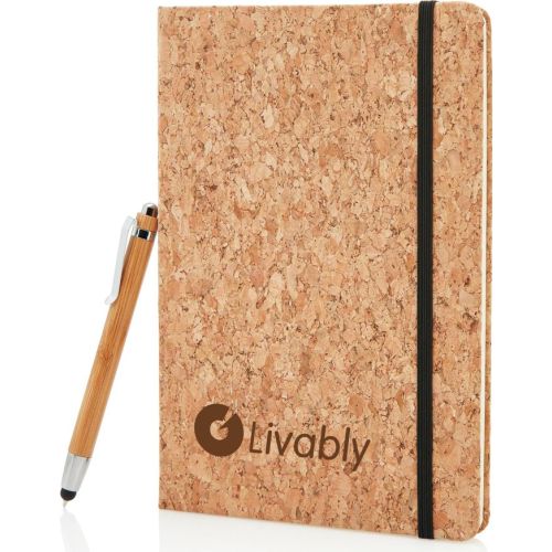 ECO Notizbuch aus natürlichem Kork mit 160 linierten Seiten von 80 g/m² Papier. Mit schwarzem Seitentrenner und schwarzem Elastikband, inkl. Bambus Stift - Stylus und schwarzschreibender Kugelschreiber. Frei von einzel- und mehrkettige, chlorinierten Paraffinen, Konformität zur SVHC-Richtlinie 1907/2006/EC, Konformität der Richtlinie für PCP Inhalt 1999/51/EC, Konformität des PAHS-Inhalts in REAC & ZEK 01-4-08, Konformität des US lead content, Konformitätität der Cadmium-Richtlinie 91/338/EC. Verpackung: Geschenkverpackung.