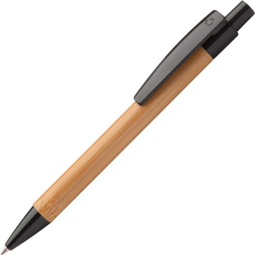 Bambus-Kugelschreiber mit Kunststoffclip und -spitze, blauschreibend.