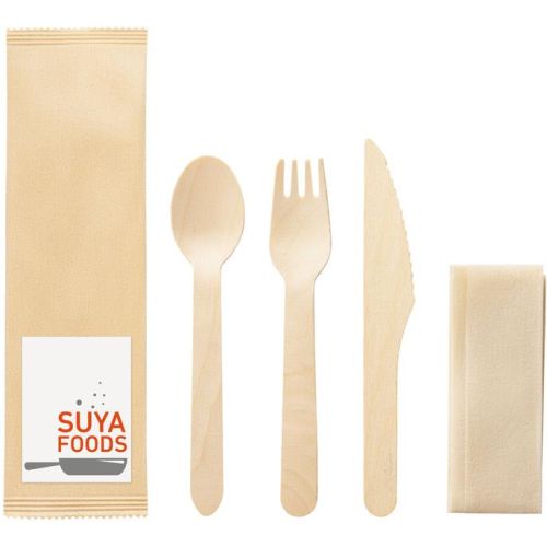 Einweg-Besteck-Set aus Holz, bestehend aus einer Gabel, einem Messer und einem Löffel. Geliefert mit einer Serviette in einer Tüte, beide aus Kraftpapier. Da das Produkt aus natürlichen Materialien hergestellt wird, können Farbe des Produkts sowie das Druckergebnis von Produkt zu Produkt unterschiedlich sein. 62 x 216 mm