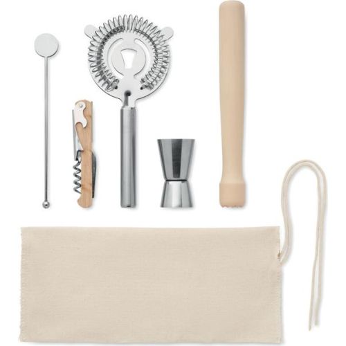 Cocktail-Set im Baumwollbeutel 220g/m² mit Kordelverschluss. Inkl. Messbecher (15 & 30 ml), Stößel aus Holz, Cocktail-Sieb, Barlöffel und Korkenzieher.