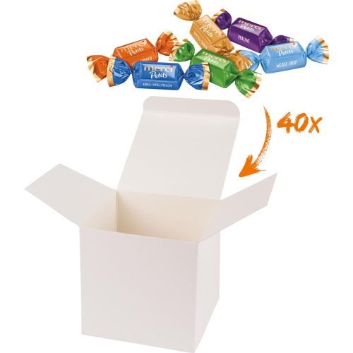 Eine ColorBox (Farbe nach Wahl), gefüllt mit 40 Merci-Chocolate Collection je 6 g. Ein bunter Mix von Merci Schokoladen-Spezialitäten in den Geschmacksrichtungen Kaffee Sahne, Edel-Vollmilch, Praliné, Mandel, Dunkle Vollmilch, Weisse Crisp und Nougat (Sortierung kann von der Abbildung abweichen). Quadratisch, flexibel und nachhaltig: die ColorBox ist ein Naturprodukt "MADE IN GERMANY" welches aus 100% Recyclingpapier hergestellt wird und in 13 leuchtenden Farben erhältlich ist. Die ColorBox kann auf Wunsch mit einem 4c Aufkleber oder 1c Druck individualisiert werden, weitere mögliche Werbeanbringungen sind eine Banderole 4c um die Box herum und ab 3000 Stück ein All-Over Druck 4c. Inhaltsangabe: Zucker, KakaoBUTTER, VOLLMILCHPULVER, Kakaomasse, SAHNEPULVER, gehackte MANDELN (4,3%), pflanzliche Fette (Palm, Shea), MAGERMILCHPULVER, gemahlene HASELNÜSSE (1,8%), MILCHZUCKER, BUTTERREINFETT, BUTTERMILCHPULVER, WEIZENMEHL, Dextrose, Reismehl, Emulgator Lecithine (SOJA), Kaffee, magerer Kakao, Fruktose, WEIZENEIWEIß, Salz, Aromen, WEIZENMALZ. Durchschnittliche Nährwerte pro 100 g: Energie: 2392 kJ/574 kcal, Fett: 37,8 g, davon gesättigte Fettsäuren 21,4 g, Kohlenhydrate: 48,8 g, davon Zucker 46,8 g, Eiweiß: 8,4 g, Salz: 0,24 g. Allergene: Alle Sorten können auch Anteile von: SAHNEPULVER, MANDELN, MAGERMILCHPULVER, HASELNÜSSE, MILCHZUCKER, BUTTERREINFETT, BUTTERMILCHPULVER, WEIZENMEHL, Emulgator Lecithine (SOJA), WEIZENEIWEIß, WEIZENMALZ., VOLLMILCHPULVER enthalten.