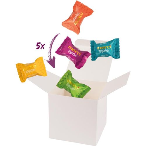 Eine ColorBox (Farbe nach Wahl) gefüllt mit 5 merci together je 9,2 g. merci together sind gefüllte Pralinen in fünf köstlichen Sorten: Nougat Crunch, Crème Brûlée Nuss, Caramel Brownie, Cappuccino Nuss und Mandel Crème (die Sortierung kann von der Abbildung abweichen). Quadratisch, flexibel und nachhaltig: die ColorBox ist ein Naturprodukt "MADE IN GERMANY" welches aus 100% Recyclingpapier hergestellt wird. Zusätzlich gibt es die Box auch aus naturbelassenem GRASKARTON - das ist Nachhaltigkeit pur! Die ColorBox kann auf Wunsch mit einem 4c Aufkleber oder 1c Druck individualisiert werden, weitere mögliche Werbeanbringungen sind eine Banderole 4c um die Box herum und ab 3000 Stück ein All-Over Druck 4c. Inhaltsangabe: Zucker, VOLLMILCHPULVER (16,6%), KakaoBUTTER, pflanzliche Fette (Palm, Shea, Kokos), HASELNÜSSE (6,4%), Kakaomasse, MILCHZUCKER, BUTTERMILCHPULVER, MANDELN (2,4%), MOLKENERZEUGNIS, Glukosesirup, WEIZENMEHL, MAGERMILCHPULVER, magerer Kakao, Emulgatoren (Lecithine (SOJA), Mono- und Diglyceride von Speisefettsäuren), kondensierte MAGERMILCH, BUTTERREINFETT, Fruktose, Dextrose, Kaffee, Aromen, SAHNEPULVER, Salz, Backtriebmittel (Ammoniumhydrogencarbonat, Natriumhydrogencarbonat, Kaliumcarbonate), Karamellzuckersirup. Durchschnittliche Nährwerte pro 100 g: Energie: 2344 kJ/562 kcal, Fett: 35,6 g, davon gesättigte Fettsäuren 19 g, Kohlenhydrate: 51,1 g, davon Zucker 48,1 g, Eiweiß: 8,2 g, Salz: 0,36 g. Allergene: Alle Sorten können auch Anteile von Haselnüsse, Milchzucker, Buttermilchpulver, Mandeln, Molkenerzeugnis, Weizenmehl, Magermilchpulver, Emulgatoren (Lecithine (SOJA), Magermilch, Butterreinfett, Sahnepulver, Vollmilchpulver enthalten.