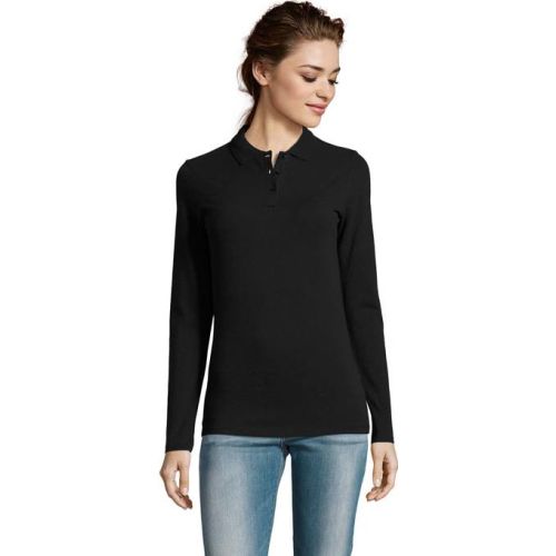 Dieses langärmelige Piqué-Poloshirt für Damen ist aus 100% gekämmter Baumwolle Piqué, 180 g/m², hat einen 1x1 Rippkragen, lange Ärmel, eine 3-Knopfleiste, einen taillierten Schnitt und ein Nackenband.