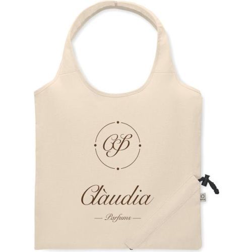 Faltbare Einkaufstasche aus recycelter Pre-Consumer-Baumwolle (70% recycelte Baumwolle und 30% RPET). 140 g/m². Artikel kann nach dem Bedrucken schrumpfen.