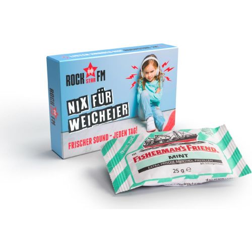 Praktische Werbekartonage, die rundum individuell veredelt werden kann, mit scharfem Inhalt. Die Kartonage aus zertifiziertem FSC-Karton® beinhaltet eine Packung zuckerfreier extra-frischer Fishermen’s Friend Bonbons in typischer Verpackung. Inhaltsgewicht: 25 g. Haltbarkeit: 18 Monate bei sachgerechter Lagerung. Lieferzeit: 15 - 20 Arbeitstage. Inklusive Werbedruck, zuzüglich Drucknebenkosten.