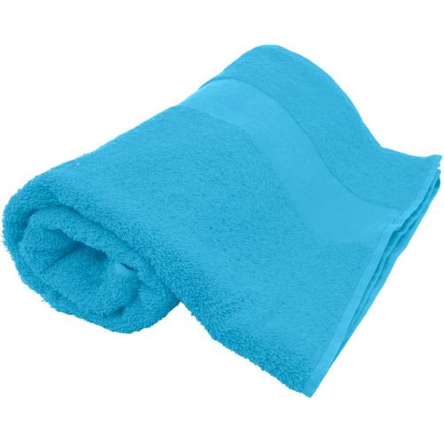 Badetuch aus Baumwollfrottee mit Aufhängeschlaufe und bedruckbarem Bordüre. Material: 100% Baumwolle, 360 g/m². Eine Bestickung ist auf Anfrage möglich.