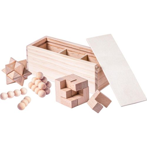 Geduldspielset mit 3 Geduldspielen aus Holz in einer Holzschachtel.