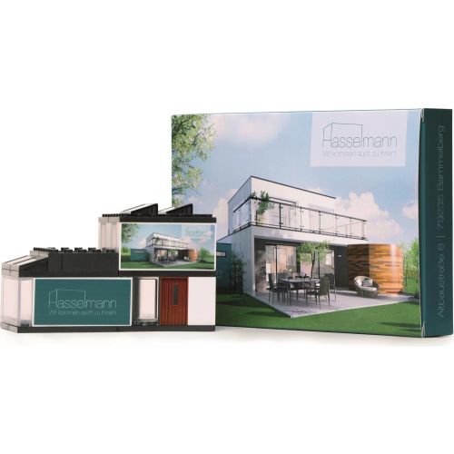Bausatz Haus, bestehend aus 43 Bauteilen aus denen ein Haus zusammengesteckt wird. Schachtel individuell gestaltet. Optional 4c Digitaldruck auf die 3 Haus-Fassadenteile. Werben Sie mit Artikeln Made in Germany.