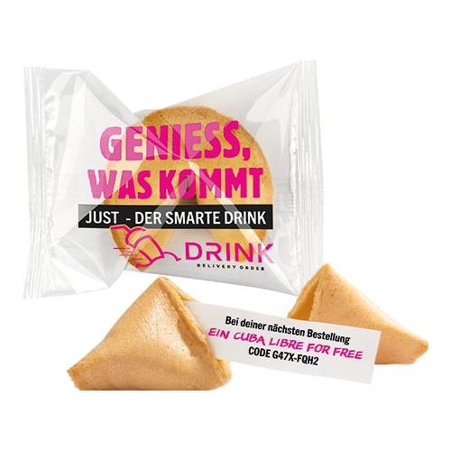 Glückskeks in transparenter oder weißer Folie, individuell bedruckt. Der Innenzettel kann je Auftrag mit bis zu 54 verschiedenen Botschaften in unterschiedlichen Designs bedruckt werden. 1 Glückskeks aus Weizenteig mit eingebackener Werbebotschaft, 6 g (weißer Innenzettel, individuell bedruckt, 1c schwarz, beidseitiger Druck Anfrage), 6 g. Lieferzeit: ca. 10-20 Arbeitstage nach Druckfreigabe. Bitte hier klicken: Zusatz-Infos nach Lebensmittel-Informationsverordnung. Bei Bedarf können Sie aus einer Vielzahl von kostenlosen Gestaltungsvorlagen auswählen. Nutzen Sie hierfür das PDF "Motivvorlagen" auf dieser Seite.