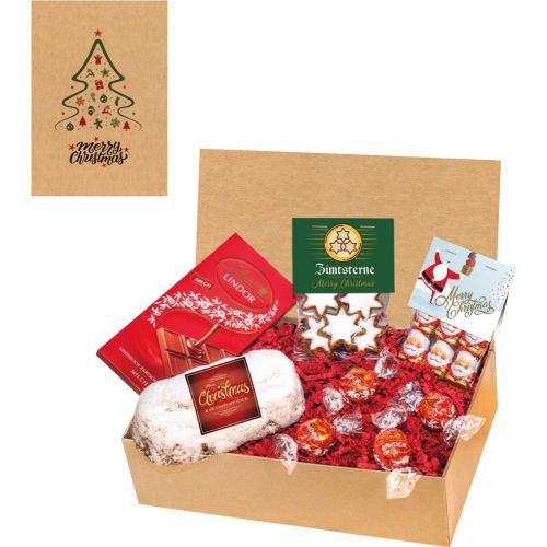 Ein Gourmet-Christstollen 200 g, 1 Beutel Mini-Weihnachtsmänner 30 g, 1 Tafel Lindt Lindor-Schokolade 100 g, 4 Lindor Kugeln Lindt je 12,5 g, 1 Beutel Zimtsterne 30 g, verpackt in Geschenkkarton Natur mit Standard-Druck "Merry Christmas" und Postversandkarton. Ab einer Menge von 200 Stück ist ein individueller 4c Druck auf der Box bereits im Preis enthalten (zuzüglich Vorkosten). Die Geschenkbox Natur ist ein vorbildlicher und nachhaltiger Geschenkkarton aus 70% recyceltem Material und 30% Material aus kontrollierter Waldwirtschaft. Die Kartonage kann auf Wunsch mit einem 4c Druck oder 1c Druck auf dem Deckel individualisiert werden. Ebenso können der Stollen mit einem Etikett 4c und die Tüten mit Mini-Weihnachtsmännern und Zimtsternen mit einen Reiter 4c individualisiert werden. Das Präsent ist postversandfähig verpackt.