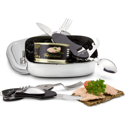 Der Berg ruft! Aber nicht nur der. Diese herzhafte Lunchbox können Sie auch gerne mit zu jedem anderen Ausflug nehmen. Sie enthält 1 Wurstdose (125 g) und 1 praktisches Camping-Besteck in einer rustikalen Lunchbox aus Metall. Das Besteck hat 6 Funktionen für unterwegs: Messer, Gabel, Löffel, Korkenzieher, Dosen- und Flaschenöffner und ist damit ein besonders pfiffiger, platzsparender Begleiter. Und jeder weiß, dass eine Brotzeit an der frischen Luft am allerbesten schmeckt! Standardartikel unveredelt versandfertig in ca. 2-3 Tagen, veredelte Ware versandfertig in ca. 2-3 Wochen. Expressversand möglich. Lieferung erfolgt ab Werk. Bitte hier klicken: Zusatz-Infos nach Lebensmittel-Informationsverordnung.
