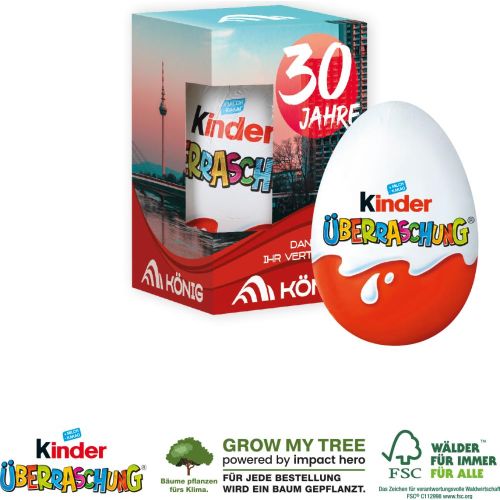 Das KinderÜberraschungs-Erlebnis! Die Kinder-Überraschung besteht aus vielen Facetten: Die Spannung beim Auspacken, die leckere Schokolade und die Freude auf das Spielzeug, das nur darauf wartet, entdeckt zu werden. Produktdetails: Kinder-Überraschung, verpackt in einer individuellen Werbekartonage. Nachhaltigkeit: Für jede Bestellung wird ein Baum über GROW MY TREE gepflanzt. Wir verwenden FSC® zertifizierten Karton aus nachhaltiger Forstwirtschaft und anderen kontrollierten Quellen. Inhalt: 1 Kinder-Überraschung - Haltbarkeit: 3 Monate. Lieferung ca. 10 - 15 Arbeitstage nach Druckfreigabe. Werbekartonage auf Anfrage gegen Aufpreis auch aus Graspapier, Naturkarton oder Coffee-Cup-Paper verfügbar!