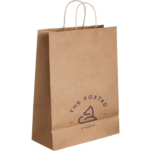 Kraftpapiertüte (115 g/m²) mit Griffen aus gedrehter Papierkordel. Hergestellt in Europa. Dieses Produkt wird aus FSC™-zertifiziertem Material und anderen kontrollierten Materialien hergestellt. 320 x 410 x 110 mm