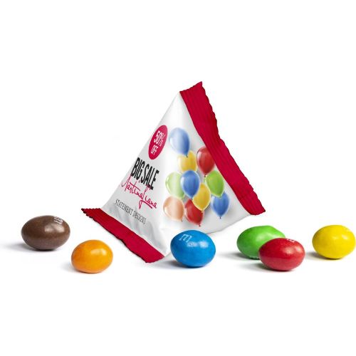 Erdnüsse mit leckerer Milchschokolade kombiniert in einer farbigen Zuckerhülle. Die beliebten bunten Schokolinsen von M&M's, verpackt im individuell bedruckten Tetraeder. Inhaltsgewicht: 10 g. Haltbarkeit: 6 Monate bei sachgerechter Lagerung. Lieferzeit: 10 - 15 Arbeitstage. Inklusive Werbedruck, zuzüglich Drucknebenkosten.
