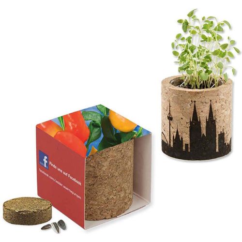 Kork ist das Trendmaterial und zeigt Ihre Naturverbundenheit. Das dekorative Pflanz-Kork rund besteht aus nachwachsendem Rohstoff und macht eine sensible Auswahl des werbenden Unternehmens sichtbar. Geliefert wird der Mini-Blumentopf mit einer Samensorte nach Wahl und einer Substrattablette als Erde. Ihre Werbung findet auf der umliegenden Banderole Platz, auch eine Lasergravur auf dem Korkgefäß ist möglich. Inklusive Werbedruck, zuzüglich Druckvorkosten. Lieferzeit: 3-4 Wochen.