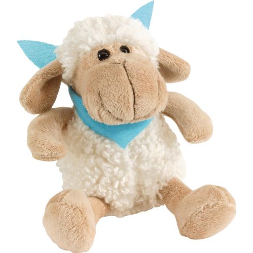 Plüsch-Schaf ROSI: mit weichem Fell und hellblauem Halstuch (separat gepackt), zum Bedrucken.