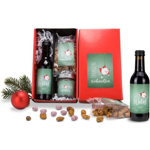 Dieses fröhliche Set verkürzt die Adventszeit und steigert die Vorfreude auf Weihnachten. Eine kleine Flasche Glühwein (0,25 l), gebrannte Mandeln aus dem Kupferkessel (100 g) und ein Glas Glühweinbonbons (100 g) versüßen die Wartezeit. Verpackt in einem roten Weihnachtskarton mit schneeweißem Sizzle. Standardartikel unveredelt versandfertig in ca. 2-3 Tagen, veredelte Ware versandfertig in ca. 2-3 Wochen. Expressversand möglich. Lieferung erfolgt ab Werk. Bitte hier klicken: Zusatz-Infos nach Lebensmittel-Informationsverordnung.