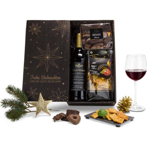 Diese edle Box wünscht nicht nur „Frohe Weihnachten und ein gutes neues Jahr“, sondern enthält auch eine weihnachtliche Kombination aus süß und herzhaft. Genießen Sie einen Rotwein Cabernet Sauvignon (0,75 l) und passend dazu 200 g Kräcker Foccacette Pomodoro & Oregano. Danach können Sie den Abend süß ausklingen lassen mit der leckeren Lebkuchenmischung (200 g). Da kommt winterliche Vorfreude auf. Standardartikel unveredelt versandfertig in ca. 2-3 Tagen, veredelte Ware versandfertig in ca. 2-3 Wochen. Expressversand möglich. Lieferung erfolgt ab Werk. Bitte hier klicken: Zusatz-Infos nach Lebensmittel-Informationsverordnung.