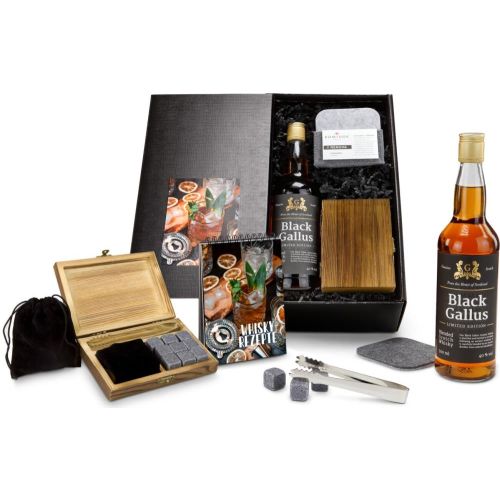 Erleben Sie einen einzigartigen Genussmoment für Whiskyliebhaber. Dieses Set bietet Ihnen alles, was Sie für eine unvergessliche Whiskyerfahrung benötigen: einen exklusiven Scotch, wiederverwendbare Eiswürfel, praktische Untersetzer und inspirierende Rezepte. Geliefert wird eine Flasche Black Gallus Limited Edition Whisky (0,7 l). Dieser Whisky wird im Herzen Schottlands nach alter Tradition destilliert und in limitierter Auflage abgefüllt. Genießen Sie den unverwechselbaren Geschmack dieses Whiskys und tauchen Sie ein in die faszinierende Welt des schottischen Nationalgetränks. Um Ihr Whiskyerlebnis zu perfektionieren, enthält das Set 9 Whiskysteine aus Granit in einer praktischen Aufbewahrungsbox aus Holz. Diese wiederverwendbaren Eiswürfel ermöglichen es Ihnen, Ihren Whisky auf die perfekte Trinktemperatur zu kühlen, ohne das Getränk zu verwässern. Die Steine werden zusammen mit einer Zange und einem praktischen Beutel für die Gefriertruhe geliefert. Vervollständigt wird das Set durch ein Whisky Rezeptbuch mit 25 verschiedenen Whisky Cocktails und Drinks (kalt und warm) und dem Untersetzer-Set Renova, bestehend aus 8 modernen Untersetzern aus veganem Filz aus 100% recyceltem PET (zertifiziert nach Global Recycling Standard. Diese zweifarbigen Untersetzer ermöglichen ein lautloses und tropffreies Abstellen Ihrer Whiskygläser und werden zusammen mit einer passenden Filztasche zur Aufbewahrung geliefert. Das Set wird in einem schwarzen Geschenkkarton mit Aufkleber präsentiert. Lassen Sie sich von den raffinierten Rezepten inspirieren und verwöhnen Sie Ihren Gaumen mit neuen Geschmackserlebnissen und tauchen Sie ein in die Welt des Whiskys - worauf warten Sie? Standardartikel unveredelt versandfertig in ca. 2-3 Tagen, veredelte Ware versandfertig in ca. 2-3 Wochen. Expressversand möglich. Lieferung erfolgt ab Werk. Bitte hier klicken: Zusatz-Infos nach Lebensmittel-Informationsverordnung.
