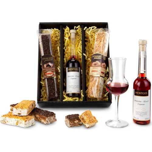 Ein Set zum Dahinschmelzen! Zwei Stangen Sofficione (italienischer Soft Nougat mit Mandeln) in den verführerischen Sorten Amaretti und Haselnusscreme (je 100 g) und ein fruchtiger MENTGES Amarena Kirsch-Liqueur (100 ml). In schwarzem Geschenkkarton mit Klarsichtdeckel. Standardartikel unveredelt versandfertig in ca. 2-3 Tagen, veredelte Ware versandfertig in ca. 2-3 Wochen. Expressversand möglich. Lieferung erfolgt ab Werk. Bitte hier klicken: Zusatz-Infos nach Lebensmittel-Informationsverordnung.