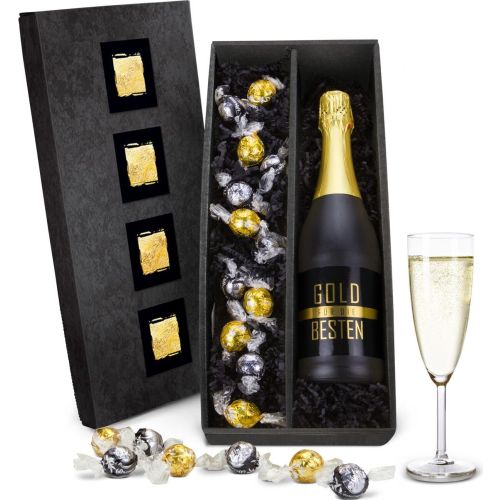 Goldene Momente „für die Besten“ oder andere wertvolle Menschen! Verschenken Sie einen hochwertigen Sekt in matt-schwarzer Flasche (Villa Römer Cuvée 0,75 l) kombiniert mit 6 goldenen und 6 schwarzen Lindt Lindor-Kugeln (ca. 150 g). Dabei ist Schwarz und Gold eine edle Kombination, die Ihre Wertschätzung ideal zum Ausdruck bringen wird. Das Set wird abgerundet durch schwarzes Sizzle und einen schwarzen Karton mit goldener Prägung. Standardartikel unveredelt versandfertig in ca. 2-3 Tagen, veredelte Ware versandfertig in ca. 2-3 Wochen. Expressversand möglich. Lieferung erfolgt ab Werk. Bitte hier klicken: Zusatz-Infos nach Lebensmittel-Informationsverordnung.