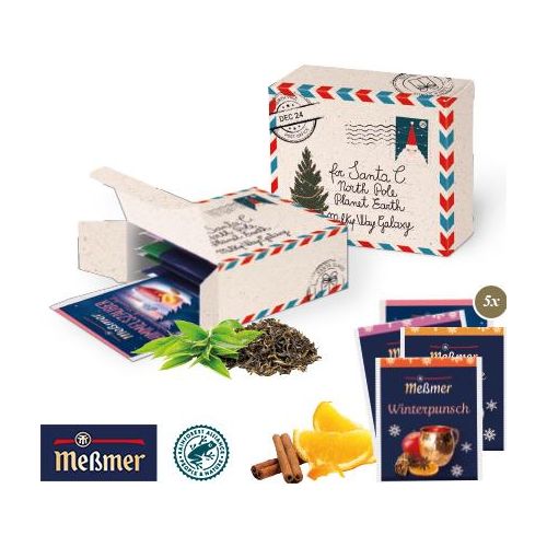 Eine Idee, die schmeckt! Verschenken Sie Genussmomente für jeden Geschmack in einer attraktiven Präsentverpackung. Ideal geeignet als kleine Aufmerksamkeit. Produktdetails: 5 Teebeutel in Aromaverpackung, in einer individuellen Werbekartonage. Nachhaltigkeit: Wir verwenden FSC®-zertifizierten Karton aus nachhaltiger Forstwirtschaft und anderen kontrollierten Quellen. Inhalt: 5 Teebeutel von Meßmer, einzeln in Aromaschutzverpackung. Geschmacksrichtungen gemischt und nach Verfügbarkeit, z. B. „Wintermagie“, „Winterpunsch“, „Gebrannte Mandeln“, „Zimt Pflaume“, „Himmelszauber“ oder „Wintertraum“. Weitere Teesorten auf Anfrage. 4-farbiger Druck auf grafischem Premium-Karton (FSC®-zertifiziert). Optional auf Graspapier, Naturkarton oder Coffee-Cup-Paper. Haltbarkeit: 12 Monate. Lieferung ca. 10 - 15 Arbeitstage nach Druckfreigabe.