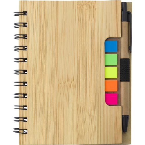 Ringbuch in Bambus-Optik mit 70 linierten Seiten und bunten Haftnotizen, inkl. Kugelschreiber mit blauer Mine.