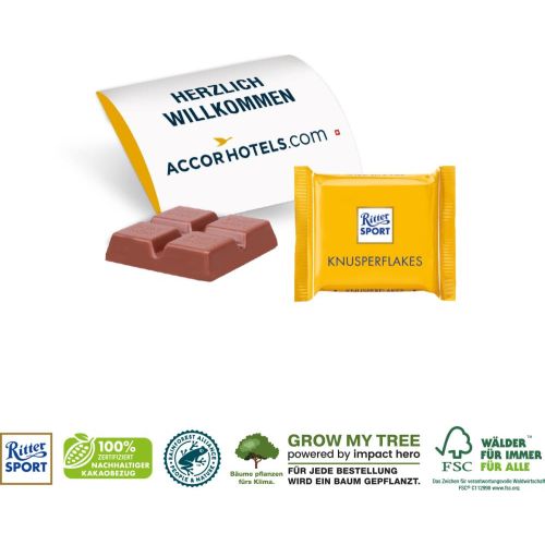 Kleine Aufmerksamkeit! Ritter Sport minis sind schon immer perfekt für jeden Anlass. Egal ob zum Teilen, als kleine Aufmerksamkeit auf Messen und Veranstaltungen oder für das Team. Produktdetails: Ritter SPORT „Mini“ verpackt in einer individuellen Werbekartonage. Nachhaltigkeit: Für jede Bestellung wird ein Baum über GROW MY TREE gepflanzt. Wir verwenden FSC® zertifizierten Karton aus nachhaltiger Forstwirtschaft und anderen kontrollierten Quellen. Inhalt: 1 Stück (ca. 16,5 g) feine Ritter SPORT „Mini“ in fünf ausgewählten Geschmacksrichtungen: Alpenmilch, Joghurt, Knusperflakes, Marzipan und Haselnuss gemischt - Haltbarkeit: 6 Monate. Lieferung ca. 10 - 15 Arbeitstage nach Druckfreigabe. Werbekartonage auf Anfrage gegen Aufpreis auch aus Graspapier, Naturkarton oder Coffee-Cup-Paper verfügbar!