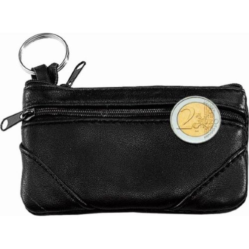 Geräumige Schlüsseltasche aus weichem Ziegenleder mit Vorfach und aufgesetzten Ecken. Rest-/Verschnitt Leder aus unterschiedlichen Produktionen, gebugt, gefüttert, VPE 500. Reißverschlüsse, 30mm Schlüsselring.