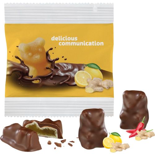 Aromatisch, süßes Fruchtgummi (ca. 70 %) umhüllt von herber Zartbitterschokolade (ca. 30 %), mit mindestens 50 % Kakao, im weißen Papierwerbetütchen verpackt. Enthält: Ingwer-Chili: Fruchtgummi mit Ingwer-Chiligeschmack (70 %) überzogen mit Zartbitterschokolade (30 %). Zutaten: Fruchtgummi (Zucker, Glukosesirup, Gelatine, Wasser, Säuerungsmittel (Citronensäure), natürliches Ingwer-Aroma mit anderen natürlichen Aromen, Chili-Extrakt, Extrakt aus der Ingwerwurzel (0,1%), Pflanzenauszüge (Saflor), Überzugsmittel (Carnaubawachs), Ingweröl (0,004%)), Zucker, Kakaomasse, Kakaobutter, VOLLMILCHPULVER, SÜSSMOLKENPULVER, Emulgator (Lecithine (SOJA)), natürliches Vanillearoma. Kakao: 50% mindestens in der Zartbitterschokolade. Kann enthalten: GLUTEN und SCHALENFRÜCHTE. Ingwer-Zitrone: Fruchtgummi mit 10 % Fruchtgehalt aus Fruchtsaftkonzentrat mit Ingwer-Zitronengeschmack (70 %) überzogen mit Zartbitterschokolade (30 %). Zutaten: Fruchtgummi (Zucker, Glukosesirup, Gelatine, Wasser, weißes Traubensaftkonzentrat, Säuerungsmittel (Citronensäure), natürliche Aromen, Weißteeextrakt, Fruchtsüße aus Apfelsaftkonzentrat, Pflanzenauszüge (Saflor), Apfelsaftkonzentrat, Extrakt aus der, Ingwerwurzel (0,1%), Birnensaftkonzentrat, Aprikosensaftkonzentrat, Überzugsmittel (Carnaubawachs), Ingweröl (0,003%)), Zucker, Kakaomasse, Kakaobutter, VOLLMILCHPULVER, SÜSSMOLKENPULVER, Emulgator (Lecithine (SOJA)), natürliches Vanillearoma. Kakao: 50% mindestens in der Zartbitterschokolade. Kann enthalten: GLUTEN und SCHALENFRÜCHTE. Füllvariante: Schokolierte Fruchtgummi-Bären. Ingwer-Chili: Nährwerte pro 100g: Energie 1726kJ / 410kcal; Fett 11g; davon gesättigte Fettsäuren 7,0g; Kohlenhydrate 71g; davon Zucker 64g; Eiweiß 5,2g; Salz 0,09g. Ingwer-Zitrone: Nährwerte pro 100g: Energie 1726kJ / 410kcal; Fett 11g; davon gesättigte Fettsäuren 6,9g; Kohlenhydrate 71g; davon Zucker 63g; Eiweiß 5,2g; Salz 0,09g. Trocken lagern. Vor Wärme schützen. Haltbarkeit: ca. 3 Monate bei sachgerechter Lagerung.