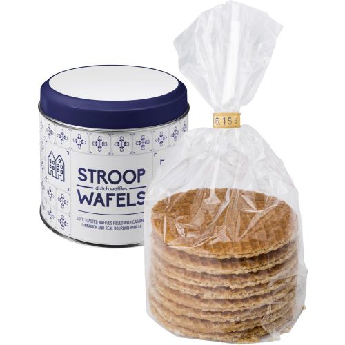 Stroopwafel 'Amsterdam', 8 Stück, in einer Metallbox verpackt, eine niederländische Spezialität bestehend aus zwei Waffeln und Karamellfüllung. Originale holländische Stroopwafels aus natürlichen Zutaten. Zwei Waffeln (8% Butter) und Karamell (50% Sirup) Sirupfüllung. Zubereitet mit natürlichen Zutaten und ohne künstliche Aromen.