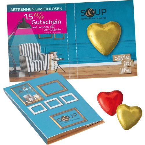 Faltkarte mit individuellem Außen- und Innenseitendruck und praktischer Abreißperforation, bestückt mit einem Schokoladenherz. Premium-Vollmilchschokolade mit mindestens 35 % Kakao. Enthält: Vollmilchschokolade. Zutaten: Zucker, VOLLMILCHPULVER, Kakaobutter, Kakaomasse, Emulgator (Sonnenblumenlecithine), Vanilleextrakt. Kann enthalten: HASELNUSS und SOJA. Kakao: 35% mindestens. Füllvariante: 1 Schokoladenherz á 8,5 g im Standarddesign „gold-metallic“ alternativ „rot-metallic“, sortenrein . Nährwerte pro 100g: Energie 2366kJ / 571kcal; Fett 38g; davon gesättigte Fettsäuren 23g; Kohlenhydrate 46g; davon Zucker 46g; Eiweiß 8,3g; Salz 0,18g. Trocken lagern. Vor Wärme schützen. Haltbarkeit: ca. 6 Monate bei sachgerechter Lagerung.