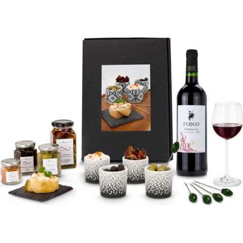Viva la Vida! Wer diese Geschenkbox öffnet, wird direkt nach Spanien auf eine Tapas Reise entführt. Probieren Sie grüne und schwarze Oliven (je ein Glas mit ca. 50 g, ohne Steine), getrocknete Tomaten (ca. 270 g) sowie den beliebten Patatas Bravas Dip (Gewürzmischung mit ca. 25 g) und genießen Sie dazu einen fruchtig-kräftigen Tempranillo (0,75 l). Die Tapas können mit dem modernen Mini-Snack-Becher-Set direkt ansprechend zum Rotwein serviert werden. 4 passende Olivenspieße werden mitgeliefert. Standardartikel unveredelt versandfertig in ca. 2-3 Tagen, veredelte Ware versandfertig in ca. 2-3 Wochen. Expressversand möglich. Lieferung erfolgt ab Werk. Bitte hier klicken: Zusatz-Infos nach Lebensmittel-Informationsverordnung.