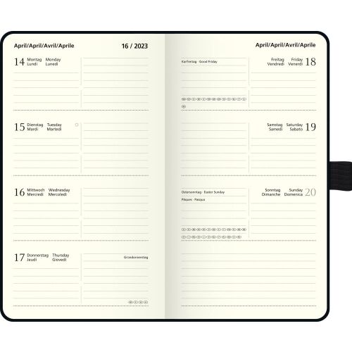 Taschenkalender im Retro-Style in der Einbandfarbe schwarz mit gerundeten Ecken. Wochenkalendarium 2 Seiten = 1 Woche, einfarbig dunkelgraues vierprachiges Kalendarium (deutsch, englisch, französisch, italienisch). Inhalt 152 Seiten cremefarbenes, tintenfestes Papier, Blattformat 8,7 x 15,3 cm, Fadenheftung, Gummizug und Stiftschlaufe schwarz, Belegsammeltasche, Kapitalband schwarz/weiß, Zeichenband schwarz. Das 16-seitige Adressheft ist auswechselbar. Blindprägung der Jahreszahl auf dem Buchrücken. Einband Casina schwarz. Der Taschenkalender ist mit Firmenwerbung innerhalb von 3-4 Wochen nach Druckfreigabe lieferbar.