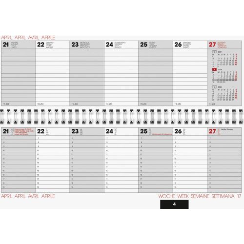 Preiswerter, viersprachiger Tischkalender (D/GB/F/I), 2 Seiten = 1 Woche. Grau/rotes Kalendarium mit 112 Seiten, Blattformat 29,7 x 10,5 cm. Kartoneinband weiß. Der Tischkalender ist mit Firmenwerbung innerhalb von 3-4 Wochen nach Druckfreigabe lieferbar.
