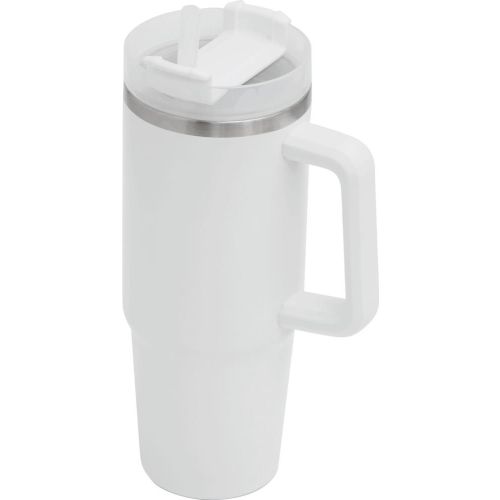 Vakuum-Trinkbecher DRINK DELUXE, doppelwandig: innen und außen aus Edelstahl, mit praktischem Griff, milchig-transparenter Kunststoffdeckel mit sicherem Schraubverschluss, Silikon-Dichtring, Trinköffnung mit Drehverschluss und transparentem Strohhalm, Füllmenge ca. 900 ml.