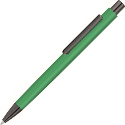Metall-Druckkugelschreiber mit ellipsenförmigem Softtouch-Gehäuse. Metallclip, Metallspitze und ellipsenförmiger Drücker GUN metallic. Mine: uma Tech Refill 1.0, schwarzes Rohr, in der Schreibfarbe blau.