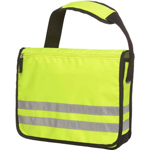 Die Umhängetasche Reflex hat ein großes Hauptfach, ein flaches Einsteckfach mit Organizerelementen, eine Reißverschlusstasche auf dem Überschlag, einen längenverstellbaren Schultergurt mit genähten Schulterpolster und ist aus leuchtend neon gelben Hauptmaterial mit 3M Reflex-Streifen.
