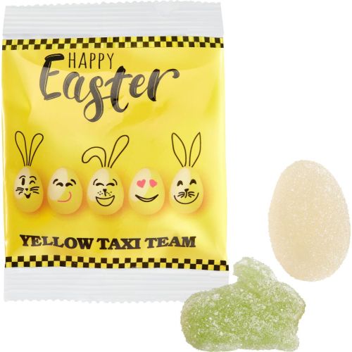 Veganes Ostergelee ohne Gelatine, bezuckert, mit Aromen und färbenden Lebensmittelkonzentraten, farblich und geschmacklich in Osterhasen- und Eiform bunt gemischt, in weißem kompostierbarem Werbetütchen verpackt. Enthält: Fruchtgummi ohne Gelatine, mit Orangen-, Passionsfrucht-, Zitronen-, Kirsch-, Himbeer- und Ananasgeschmack. Zutaten: Glukosesirup, Zucker, Geliermittel: Pektin; Säuerungsmittel: Citronensäure; Lebensmittelkonzentrate (Holunder, Spirulina, Saflor, Roter, Rettich), natürliche Aromen. Füllvariante: 2 Stück Gelee-Fruchtgummis in Osterformen. Nährwerte pro 100g: Energie 1535kJ / 361kcal; Fett <0,5g; davon gesättigte Fettsäuren 0g; Kohlenhydrate 88g; davon Zucker 67g; Eiweiß 0,1g; Salz 0,47g. Trocken lagern. Vor Wärme schützen. Haltbarkeit: ca. 6 Monate bei sachgerechter Lagerung.