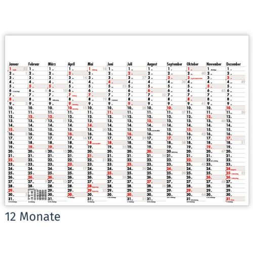 Wandplaner 99 x 69 cm, Kalendarium: 1-sprachig deutsch, 12, 13, 14 oder 15 Monate, Feiertage: deutsch, Material: 170 g/m² Bilderdruck matt, Wandplaner: Offsetdruck, Versand: zu 50 Stück im Umkarton, Einzelversand möglich (gerollt; gefalzt bedingt möglich).