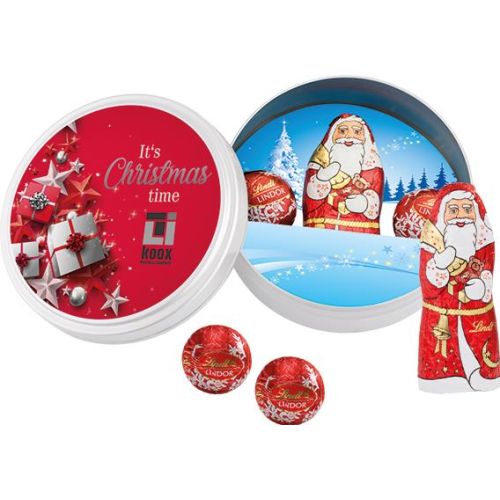 Runde Dose mit Stülpdeckel, weiß, aus Metall (Weißblech 98% recycelbar), mit Lindt Weihnachtsfüllung, Deckel individuell bedruckt. Mit weihnachtlich gestaltetem Einleger. 1 Lindt Schoko Weihnachtsmann aus feiner Alpenvollmilchschokolade und 2 LINDOR Mini Milchkugeln, 19 g Saisonartikel - solange der Vorrat reicht!. Lieferzeit: ca. 10-20 Arbeitstage nach Druckfreigabe. Bitte hier klicken: Zusatz-Infos nach Lebensmittel-Informationsverordnung Haltbarkeit: Bis mind. 31.03.2026. Bei Bedarf können Sie aus einer Vielzahl von kostenlosen Gestaltungsvorlagen auswählen. Nutzen Sie hierfür das PDF "Motivvorlagen" auf dieser Seite.
