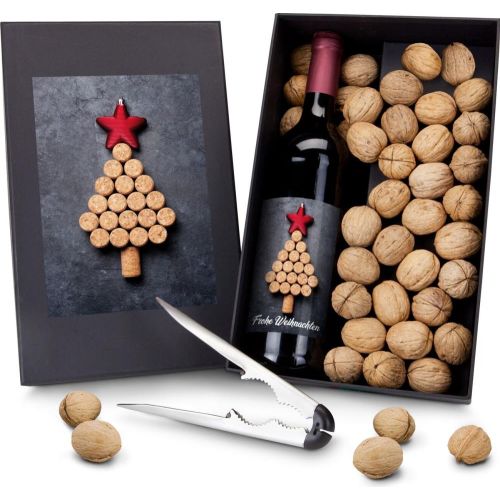 Dieses Set verspricht einen gemütlichen Abend, z. B. vor dem Kamin, mit einem guten Glas Rotwein und vielen Nüssen. Der schwarze Geschenkkarton mit Stimmungsaufkleber enthält neben einem französischen Rotwein Cabernet Sauvignon (0,75 l) noch 400 g Walnüsse und einen modernen Nussknacker aus robustem Edelstahl mit Kunststoffgelenk und Nussaussparung in zwei Größen. Nuss für Nuss ein Genuss. Standardartikel unveredelt versandfertig in ca. 2-3 Tagen, veredelte Ware versandfertig in ca. 2-3 Wochen. Expressversand möglich. Lieferung erfolgt ab Werk. Bitte hier klicken: Zusatz-Infos nach Lebensmittel-Informationsverordnung.
