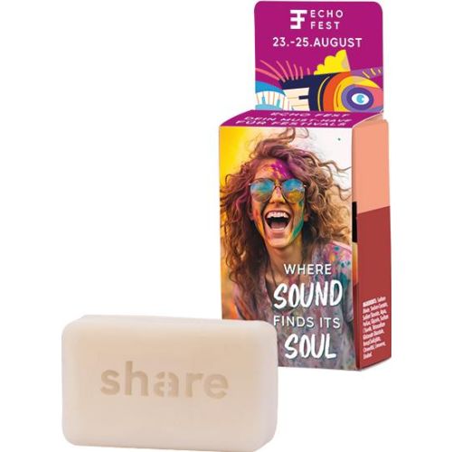 Werbecover aus weißem Karton, mit share feste Seife, Cover individuell bedruckt. 1 share feste Seife (original verpackt) mit Pfirsich & Orange, 100 g. Lieferzeit: ca. 10-20 Arbeitstage nach Druckfreigabe. Bitte hier klicken: Zusatz-Infos nach Lebensmittel-Informationsverordnung Haltbarkeit: Nach dem Öffnen innerhalb von 12 Monaten zu verbrauchen. Bei Bedarf können Sie aus einer Vielzahl von kostenlosen Gestaltungsvorlagen auswählen. Nutzen Sie hierfür das PDF "Motivvorlagen" auf dieser Seite.