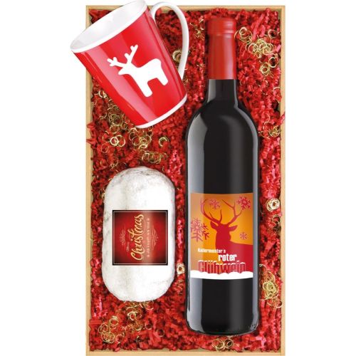 Eine Flasche Glühwein 1,0 l, 1 exklusive Glühweintasse, 1 Gourmet-Christstollen 200 g, verpackt im Geschenkkarton Natur mit Klappdeckel und Standardmotiv "Merry Christmas". Ab einer Menge von 200 Stück ist ein individueller 4c Druck auf dem Deckel der Box bereits im Preis enthalten (zuzüglich Vorkosten). Die Geschenkbox Natur ist eine vorbildliche und nachhaltige Geschenkverpackung aus 70% recyceltem Material und 30% Material aus kontrollierter Waldwirtschaft. Die Kartonage kann auf Wunsch mit einem 4c Druck oder 1c Druck auf dem Deckel individualisiert werden. Zusätzlich können auch die Glühweinflasche und der Gourmet-Christstollen mit einen Etikett 4c individuell gestaltet werden. Das Präsent ist postversandfähig verpackt.